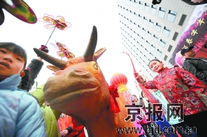 金寶街上,歡快的鑼鼓響起,兩千多個風車嘩啦啦作響,迎春祈福活動開始。一頭由北京泥塑藝術家雙彥制作的塑鋼黃牛佇立在街頭。“這頭牛身長三尺六寸五,象征一年365天;牛尾長一尺二寸,象征一年12個月;四蹄象征四季;柳條象征春天。我們是依照民俗專家的建議,按古人的方法制作的。”建國門工委書記王紅一臉喜氣地介紹。