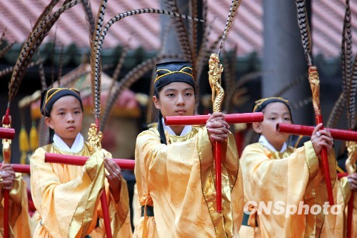 9月28日清晨,臺北孔廟隆重舉行祭孔大典,紀念孔子誕辰2559周年。活動遵循傳統古禮儀節,分37步驟。圖為多年來擔任佾生的臺北大龍小學生,以六佾舞行獻禮,展現“誠于中,形于外”的姿儀,表達對孔子的尊崇與贊頌。