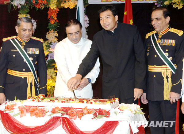 10月2日晚,在位于巴基斯坦首都伊斯蘭堡的中國大使館,巴總統扎爾達里(左二)與中國駐巴大使羅照輝共同切蛋糕慶祝新中國60華誕。當日,扎爾達里出席中國駐巴使館舉行的招待會。新華社記者李敬臣攝