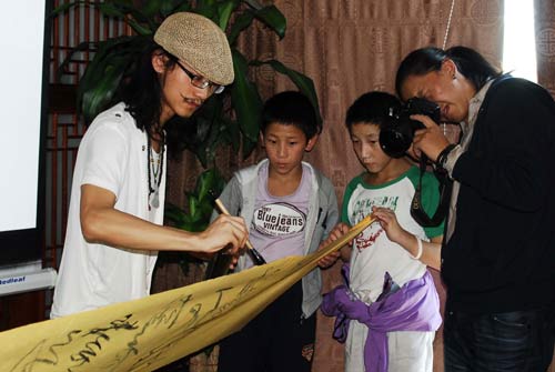 下午2時,被譽(yù)為“鬼才”的田七先生帶著筆墨紙硯和古箏出現(xiàn)在22個孩子面前。則熱福利院院長李星陸介紹說,在玉樹地震中,該福利院的院墻都已經(jīng)倒塌,無法使用。在北京市各界人士的關(guān)懷下,該福利院22名孩子來到了北京求學(xué)、居住,其中9名是震后孤兒,他們最小的8歲,最大的17歲。“今天很高興鬼才田七先生能來的孩子們面前,希望這些心靈受過創(chuàng)傷的孩子們能以田七先生為榜樣,熱愛生活、善于發(fā)現(xiàn)美的東西、傳承國學(xué)!”