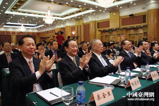 第五屆兩岸經貿文化論壇專題報告7月11日上午在長沙舉行,圖為中國國民黨副主席吳敦義(前排左三)、新黨主席郁慕明(前排左二)和親民黨秘書長秦金生(前排左一)等出席。(中國臺灣網 鐘寶華 攝)
