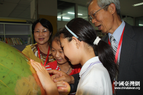 臺灣云林縣北辰小學校長丁招弟和同學們合影 (中國臺灣網 董潔 攝)
