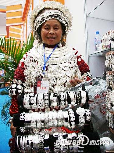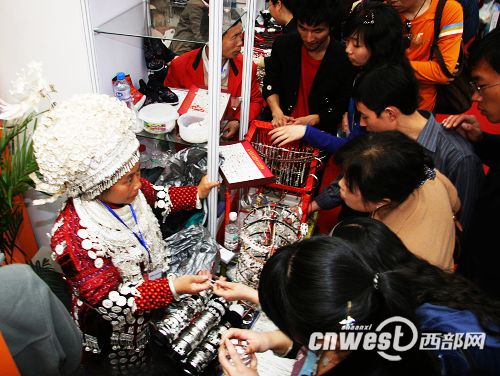 西部網(wǎng)訊(記者 李楠 張喆) 2008年4月6日,西洽會(huì)進(jìn)入第二天,各大展館內(nèi)依舊人流如織,熱鬧非凡。B2展館內(nèi)的一個(gè)專(zhuān)售少數(shù)民族銀飾的小攤前更是密密麻麻站滿了人。究竟是什么吸引了這些逛會(huì)的市民呢,記者為您揭開(kāi)謎底。