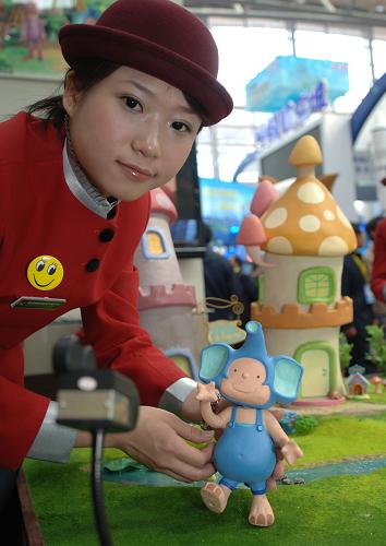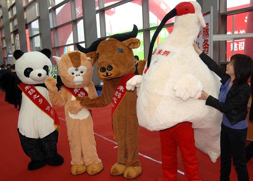 4月8日,在西安曲江會展中心,陜西洋縣的參展人員用卡通造型展示生活在其境內(nèi)的大熊貓、金絲猴、羚牛、朱鹮等珍稀野生動物。