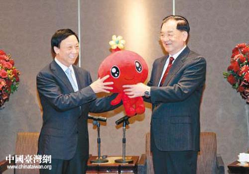中共陜西省委常委、西安市委書記孫清云向國民黨榮譽主席連戰贈送西安世園會吉祥物(陜西省臺辦通訊員 霍炳男 攝)