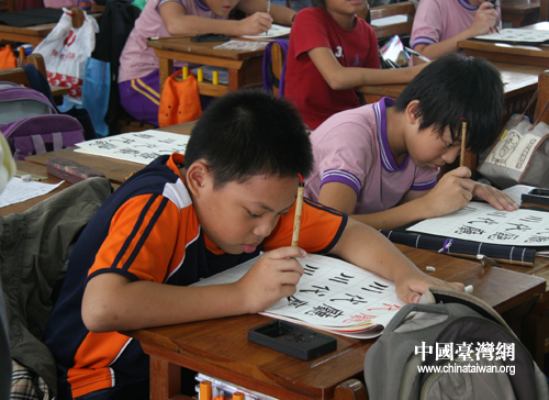 苗栗福星小學的孩子們正在練習毛筆字(攝影 齊曉靖)