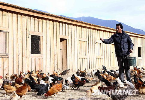 資料圖片:尼瑪在西藏米林縣一養(yǎng)殖場為飼養(yǎng)的藏雞喂食,他在當(dāng)?shù)卣С窒拢瑥?007年開始飼養(yǎng)藏雞、藏豬,現(xiàn)年收入已達(dá)6萬元(1月11日攝)。新華社記者陳建力攝