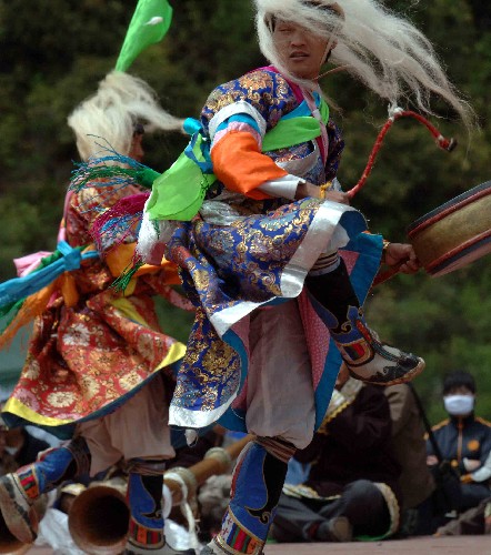 資料圖片:2007年5月28日,在“藏醫(yī)藥文化節(jié)”上,當(dāng)?shù)鼐用裨谶M(jìn)行民俗表演。(李文)(圖片來源:新華網(wǎng))