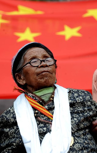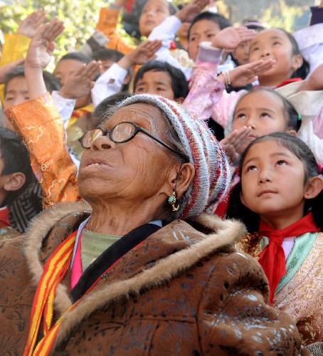 4月4日,老阿媽次仁曲珍參加迎接國旗的儀式。 新華社記者 索朗羅布 攝