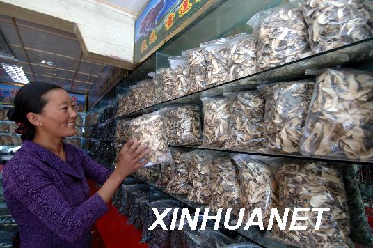 資料圖片:西藏林芝地區(qū)工布江達(dá)縣巴河鎮(zhèn)農(nóng)民瓊達(dá)在自家開辦的土特產(chǎn)店內(nèi)擺放貨物。她家銷售松茸等土特產(chǎn)每年增收2萬(wàn)多元(2007年5月26日攝)。新華社記者 格桑達(dá)瓦 攝
