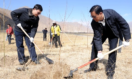 資料圖片:3月11日,北京援藏干部在拉薩河谷植樹。 當日,在拉薩市工作的50多名北京援藏干部來到堆龍德慶縣羊達鄉,進行植樹活動,創建“援藏林”。 新華社記者 索朗羅布 攝