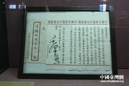 1954年,毛澤東寫給十四世達(dá)賴?yán)锏男。(中國臺(tái)灣網(wǎng) 李典典 攝)
