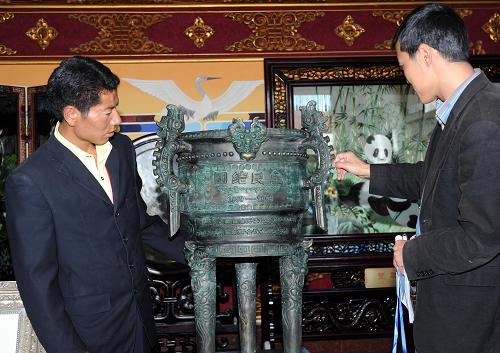 當日,全國政協在拉薩向西藏自治區政協贈送一尊象征團結民主、和諧的紀念鼎——“團結民主紀念鼎” 。新華社記者覺果攝
