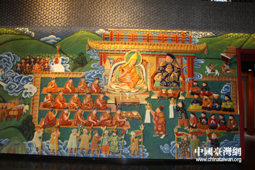 進門之后,映入眼簾的是一幅大型浮雕壁畫,描述了五世達賴喇嘛赴京覲見順治皇帝的場景。(中國臺灣網(wǎng) 李典典攝)