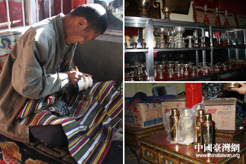 右 上圖為扎西吉彩金銀銅器廠的手工制品 下圖為銅制暖壺(中國(guó)臺(tái)灣網(wǎng) 李典典攝)