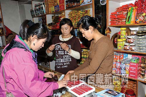 2009年6月,拉薩來(lái)的游客白央(左)在樟木口岸一家旅游商店購(gòu)物。(圖片來(lái)源:《西藏日?qǐng)?bào)》王緒彬 攝)