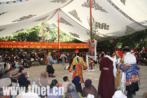 資料圖片:隨著雄勁的鼓鈸聲響,2008中國拉薩雪頓節藏戲匯演在羅布林卡拉開序幕,圖為演出現場。扎西平措 攝(圖片來源:中國西藏信息中心)