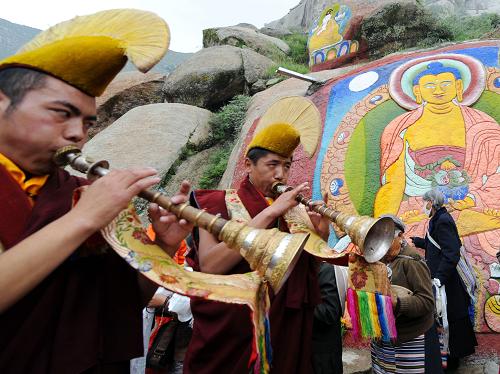 資料圖片:8月20日,拉薩色拉寺僧人在展佛儀式上吹響法號(hào)。新華社記者 覺果 攝