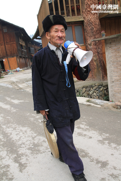 西江千戶苗寨中年級最大的鳴鑼響寨員,提醒大家千萬要防火(中國臺灣網(wǎng) 楊永青 攝)