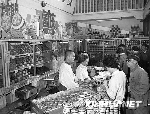 1963年國慶節、中秋節接踵而來,北京市食品市場,呈現出一片繁忙熱鬧的景象。全市的各個商場、食品店、水果攤為顧客們準備了豐富多樣的節日食品,供人們歡度佳節。為了讓人們過好中秋節,首都各食品商店準備了各色中秋月餅。新華社記者顧德華攝
