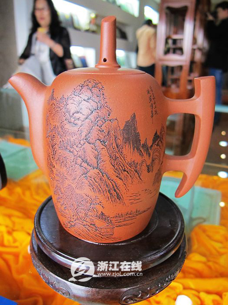在這些紫砂壺中,最讓人稱奇的是一把茶壺上刻了3000多字。這件作品是紫砂專家、浙江省民間工藝美術(shù)大師吳偉華的杰作,而這種在紫砂上進(jìn)行微雕的技術(shù),也是他近年來的獨(dú)創(chuàng)。