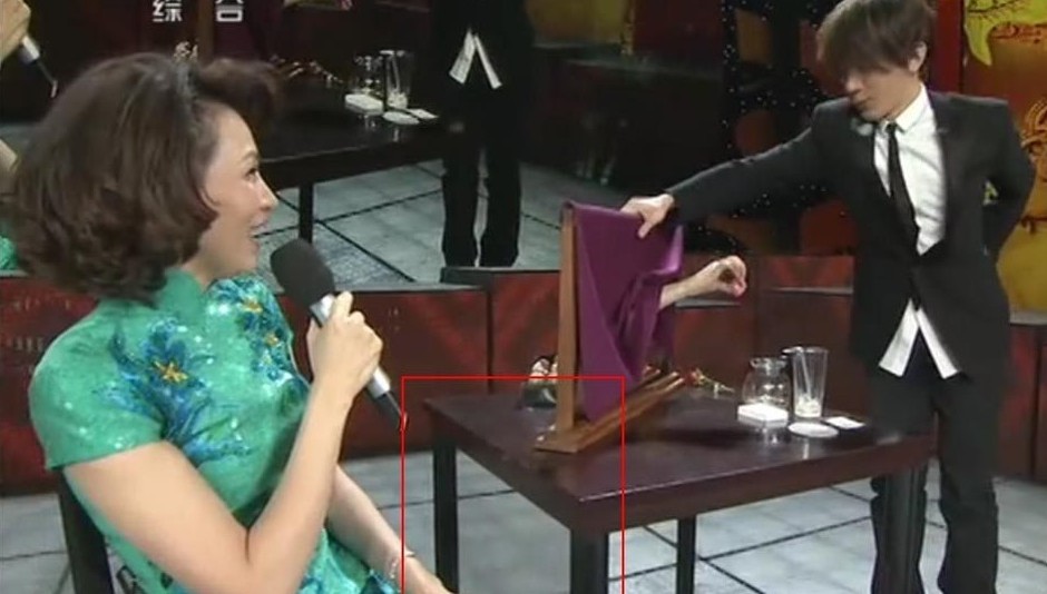 網友揭秘劉謙春晚魔術。桌子下面有個鏡子,就是說實際上只有一半位置是空間,另一半是個三角形的箱子,里面藏了人。注意看劉謙開始做的那個位置桌子下面的顏色,很不自然。