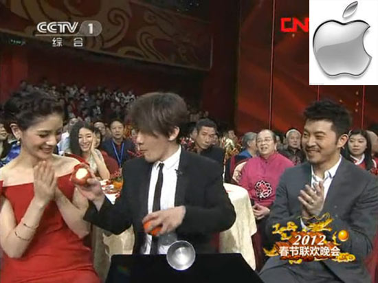 在劉謙開始表演魔術時,他先對身邊的胡可和沙溢夫婦變出了球,再向后一拋變出一個蘋果。他咬了蘋果一口后,將蘋果遞給了身邊的胡可。有網(wǎng)友驚呼:“這不是那個著名的電腦商標嗎?……”