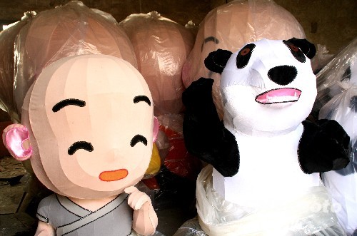 當天裝箱啟程的花燈為二十九盞沙彌燈和三盞大熊貓燈。其中卡通版的沙彌燈造型千姿百態,沙彌或立、或坐、或臥、或躺,有的攥佛珠,有的肩挑水桶,一招一式栩栩如生。尤其奪人眼球的是采用透光處理技術制作的小沙彌一米高“娃娃大頭”,凸顯俏皮活潑形象。