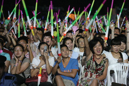 盡管大連理工大學(xué)體育場能容納的觀眾遠(yuǎn)不及觀眾熟悉的大連市體育場,但昨晚“小平島之夜”縱貫線大連巡回演唱會依舊涌出人海狂潮的撼人場面,離7時30分演唱會開始尚有很長時間,看臺上的觀眾早就因激情難耐而自發(fā)大合唱了。