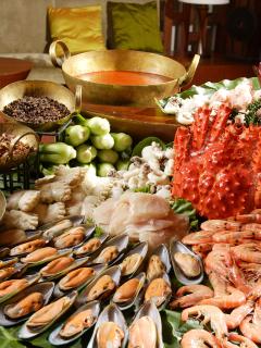 由日本空運(yùn)來(lái)臺(tái)的北海道帝王蟹、草蝦、花枝和各式貝類,在下鍋烹煮之后,再沾上以豆腐乳為基底,加入羅望子醬、魚(yú)露、泰式辣椒粉及香茅拌勻,搭配上花生粉及芝麻的泰式沾醬,美味很正點(diǎn)。(圖片提供/臺(tái)北晶華)