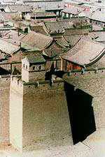 鳥瞰平遙古城,更令人稱奇道絕。這個呈平面方形的城墻,形如龜狀,城門六座,南北各一,東西各二。城池南門為龜頭,門外兩眼水井象征龜的雙目。北城門為龜尾,是全城的最低處,城內所有積水都要經此流出。城池東西四座甕城,雙雙相對,上西門、下西門、上東門的甕城城門均向南開,形似龜爪前伸,唯下東門甕城的外城門徑直向東開,據說是造城時恐怕烏龜爬走,將其左腿拉直,拴在距城二十里的麓臺上。這個看似虛妄的傳說,閃射出古人對烏龜的極其崇拜之情。烏龜乃長生之物,在古人心目中自然如同神靈一樣圣潔。它凝示著希冀借龜神之力,使平遙古城堅如磐石,金湯永固,安然無恙,永世長存的深刻含義。 城墻上還有72個觀敵樓,墻頂外側有垛口3千個,傳說它是孔子3千弟子、72賢人的象征。